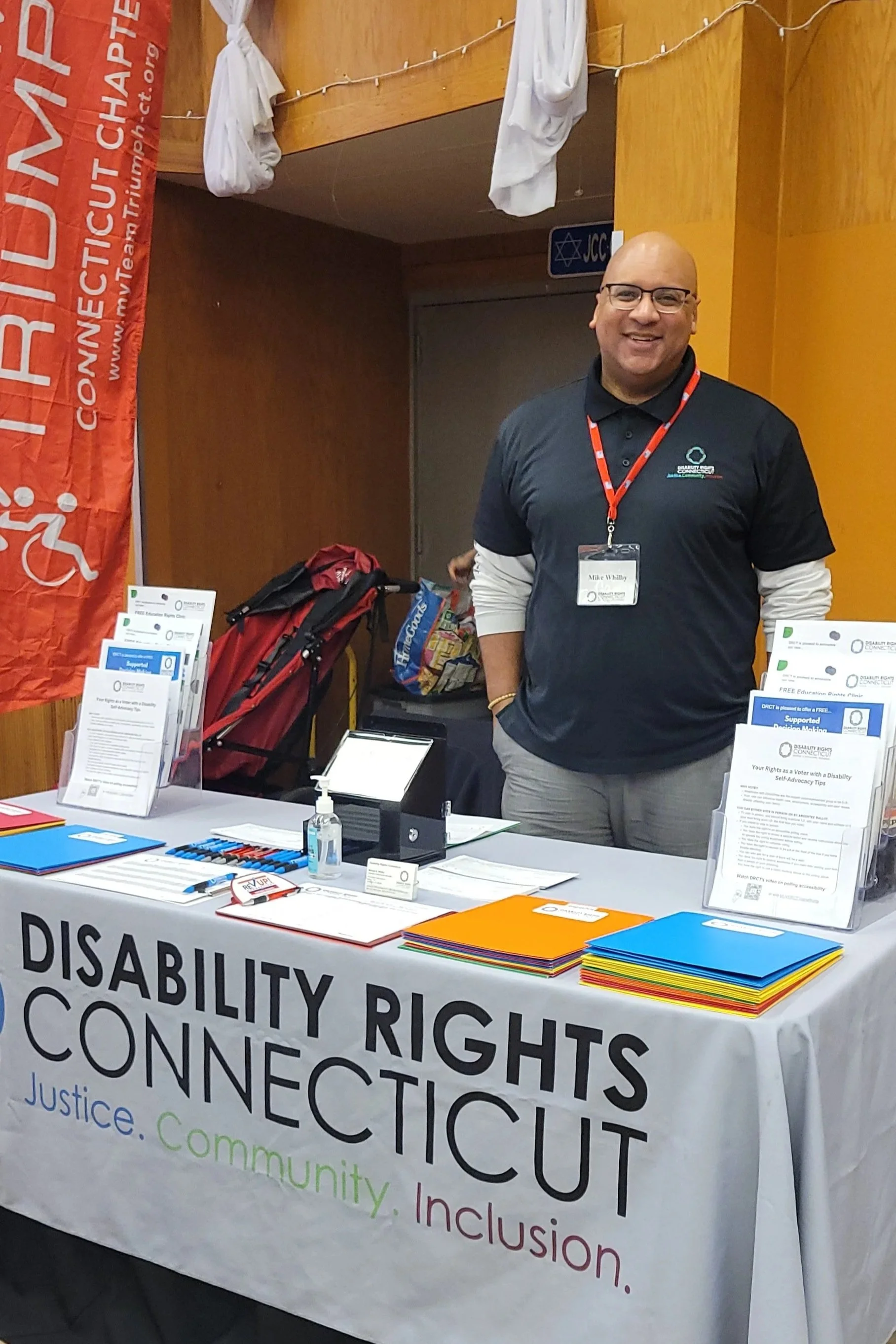 DRCT”s Strategic Partnerships Manager, Mike Whilby standing behind DRCT’s resource table in the Stamford Jewish Community Center. In the background: A wooden wall with white drapes hanging down.