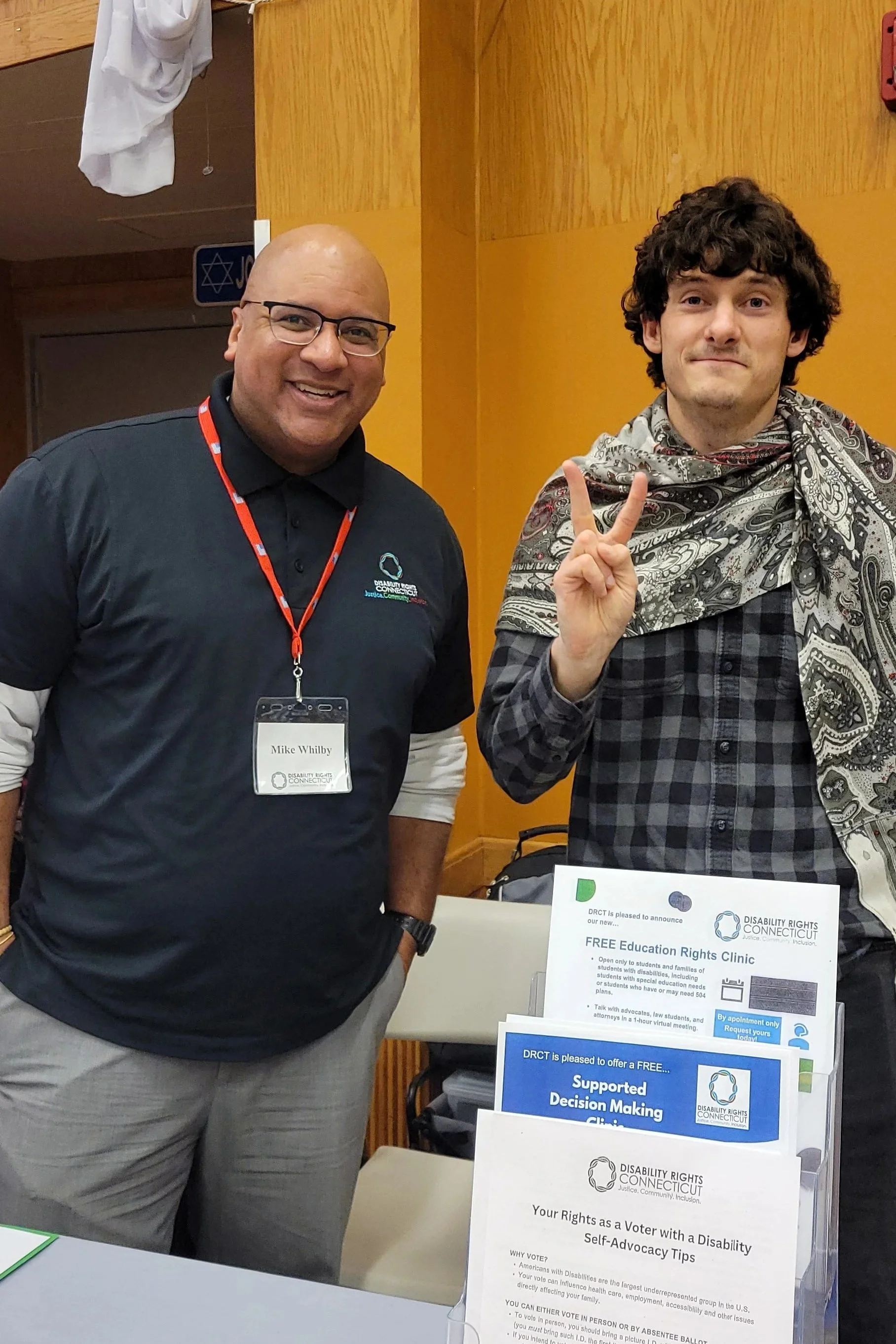 DRCT”s Strategic Partnerships Manager, Mike Whilby, and Board of Directors Member, Andrew Arboe standing behind DRCT’s resource table in the Stamford Jewish Community Center. In the background: A wooden wall with white drapes hanging down.