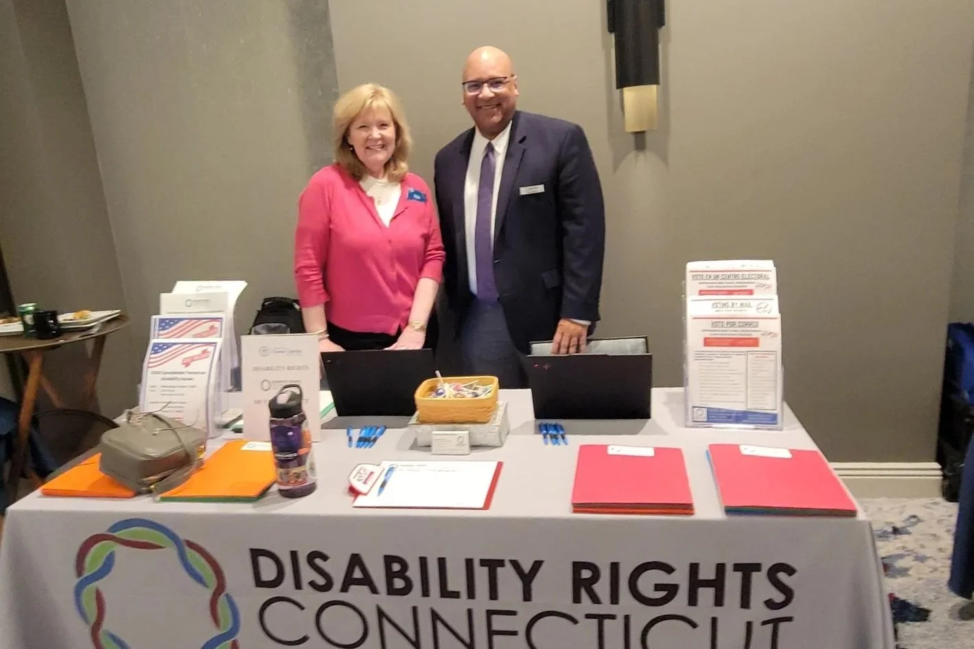 DRCT’s Strategic Partnerships Manager, Mike Whilby, and Senior Advocate, Jennifer Jenkins standing behind DRCT’s resource table outside the Mariott ballroom.