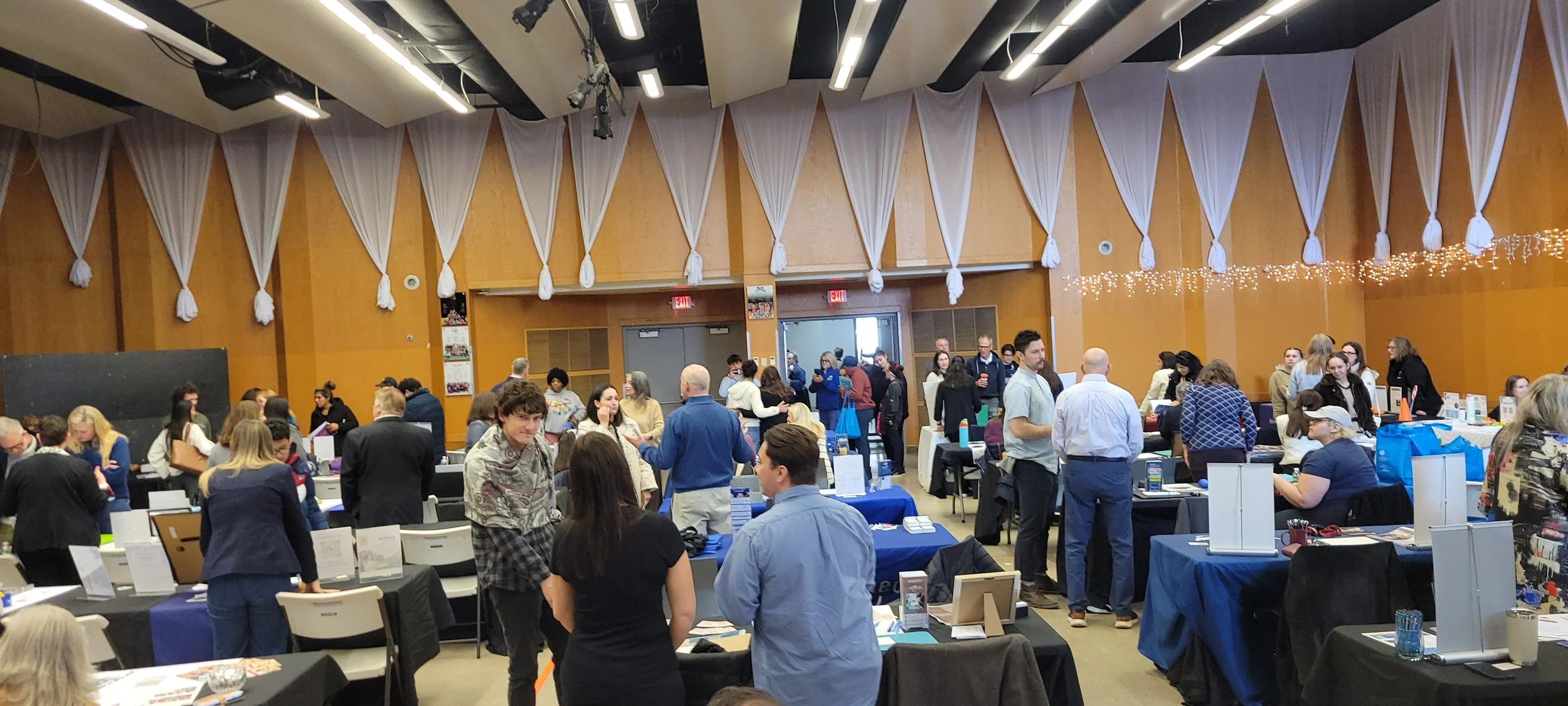 Multiple attendees standing and talking with other vendors at their resource tables in the Stamford Jewish Community Center. Wooden walls with white drapes hanging down.